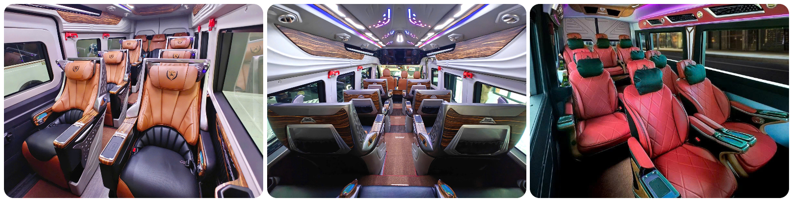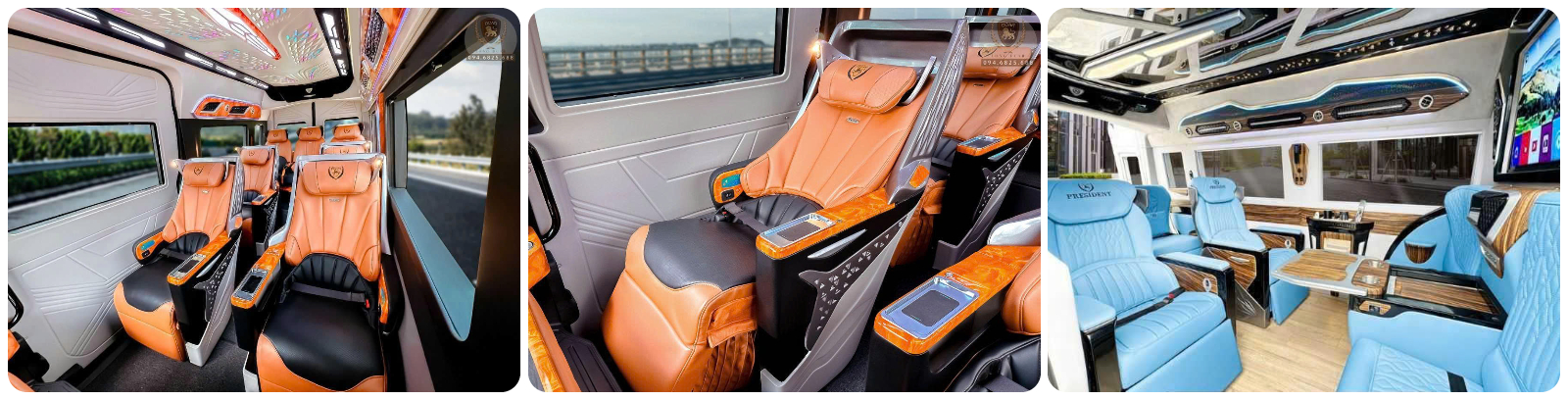 Nội thất: Ghế da hoặc bọc da cao cấp, tựa đầu cao, đệm êm, ngả sâu, khoảng cách giữa các ghế rộng rãi. Hệ thống điều hòa riêng, TV màn hình lớn, wifi miễn phí, ổ cắm USB sạc tiện lợi.
