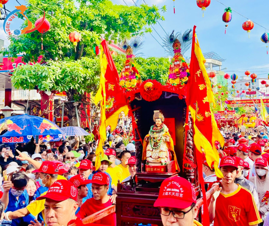 Từ nửa đêm ngày 14, không khí lễ hội chùa Bà Thiên Hậu đã trở nên thật trang nghiêm. Ngôi chùa được trang hoàng lộng lẫy với hàng ngàn chiếc đèn lồng, cờ quạt. 12 chiếc lồng đèn khổng lồ tượng trưng cho 12 tháng trong năm được treo cao, soi sáng cả một góc trời. Sáng ngày 15, kiệu Bà được trang trọng rước đi giữa đoàn người quanh thành phố, tạo nên một không khí vừa linh thiêng, vừa náo nhiệt, cầu mong một năm mới an lành, thịnh vượng.